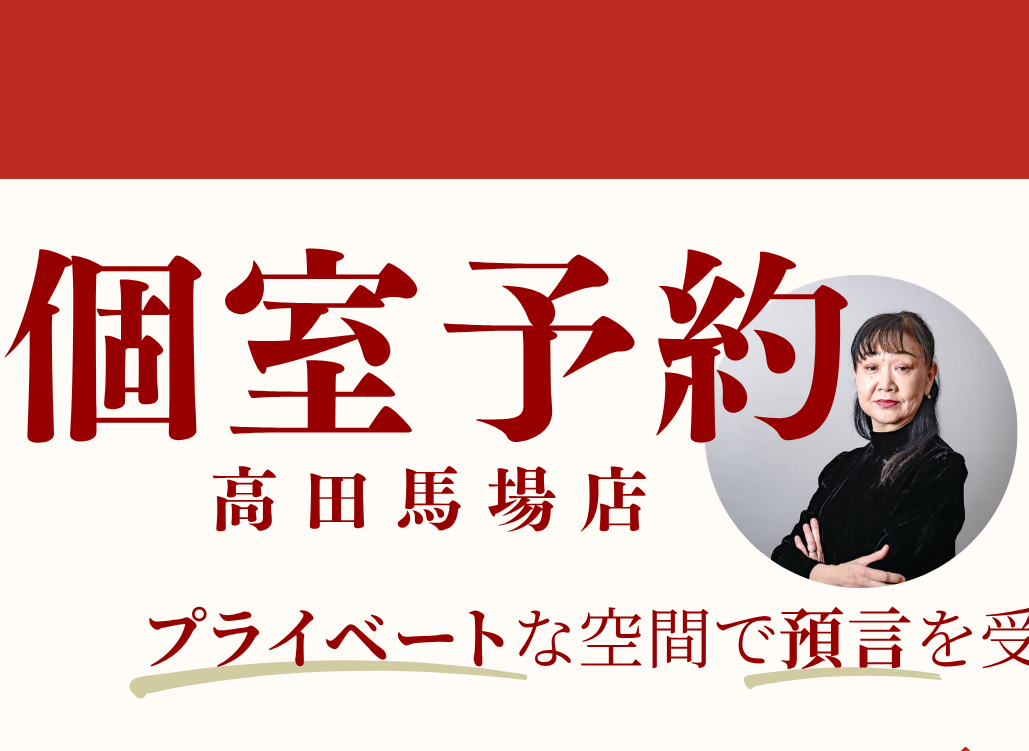 個室でプライベートに預言を受けられるサービス。祈りや相談も可。火曜・高田馬場店限定。完全予約制。